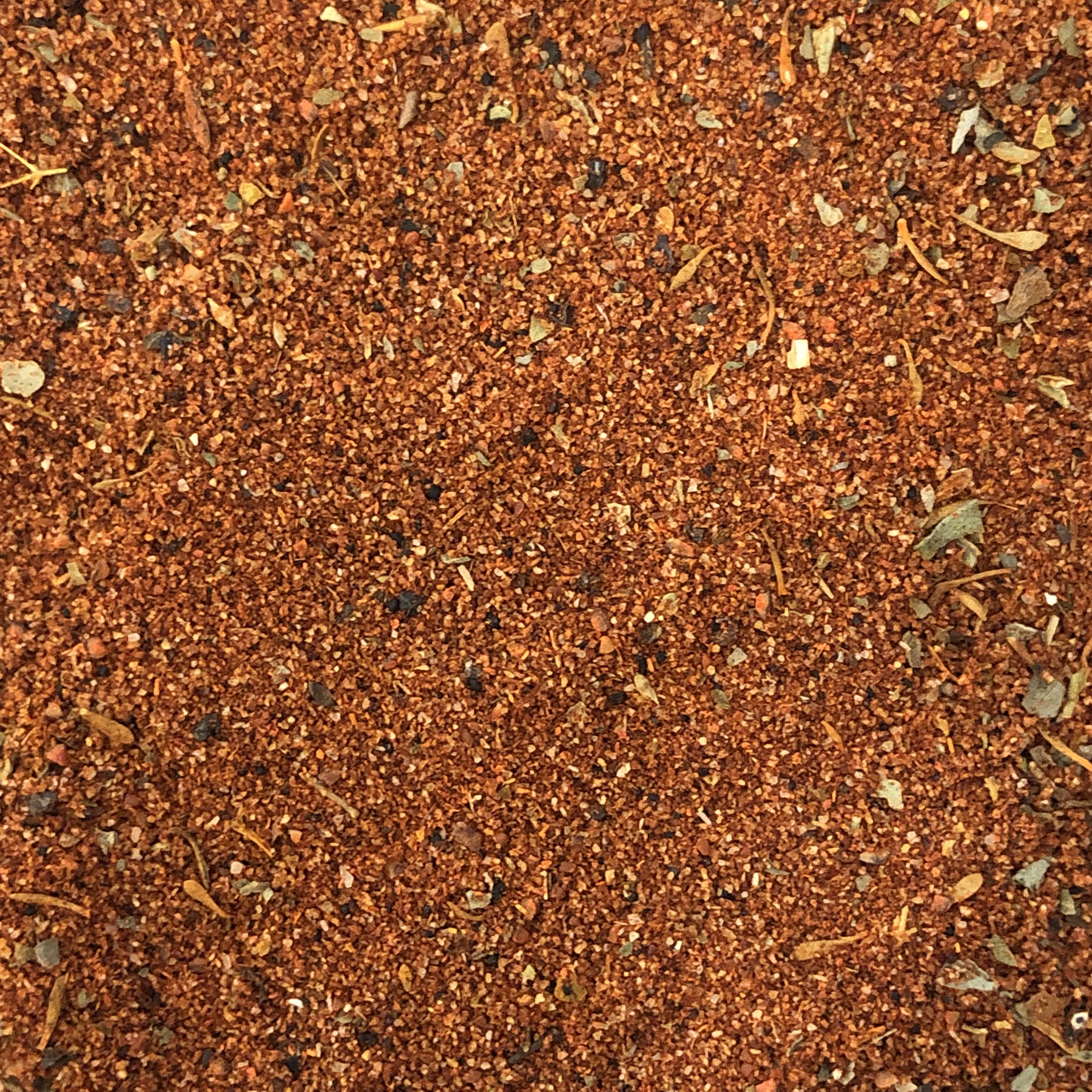 Dark chili, garlic, cumin, oregano, basil, thyme, onion, salt, black pepper, chili, cayenne, paprika (There is a 2 ounce minimum for each spice)