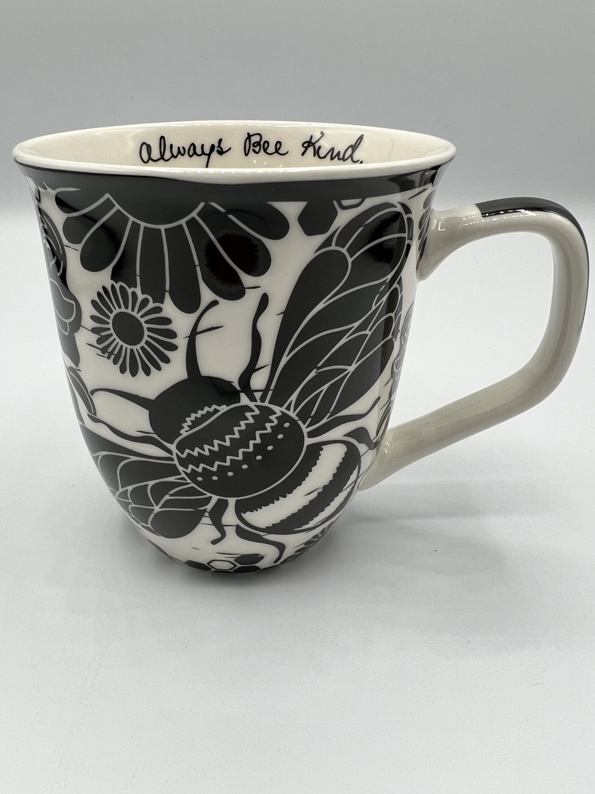 Fun and whimsical bohemian-styled mug, with the phrase "Always Bee kind" printed on the inside lip.
