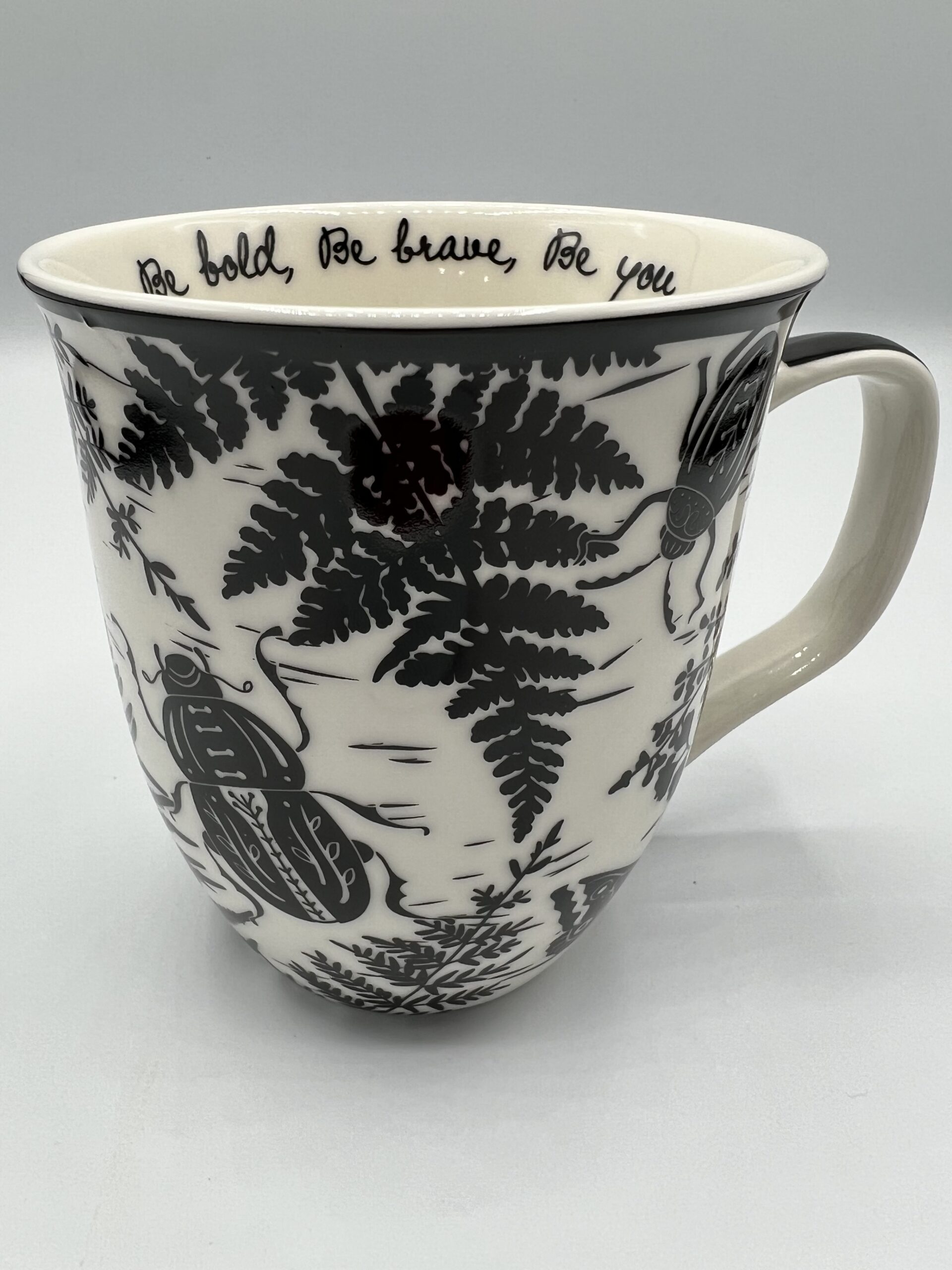 Fun and whimsical bohemian-styled mug, with the phrase"Be bold, be brave, be you" printed on the inside lip.