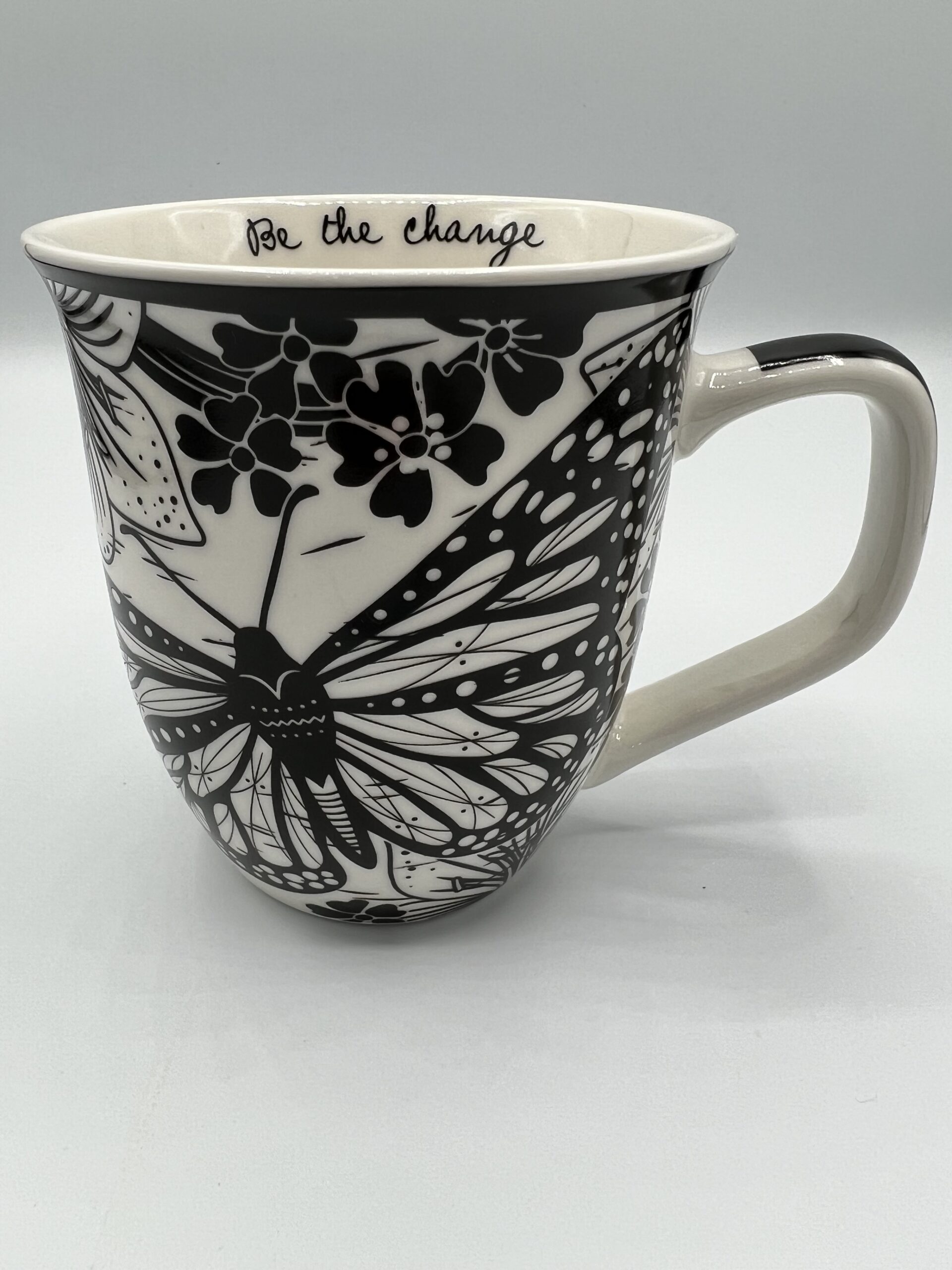 Fun and whimsical bohemian-styled mug, with the phrase "Be the change" printed on the inside lip.