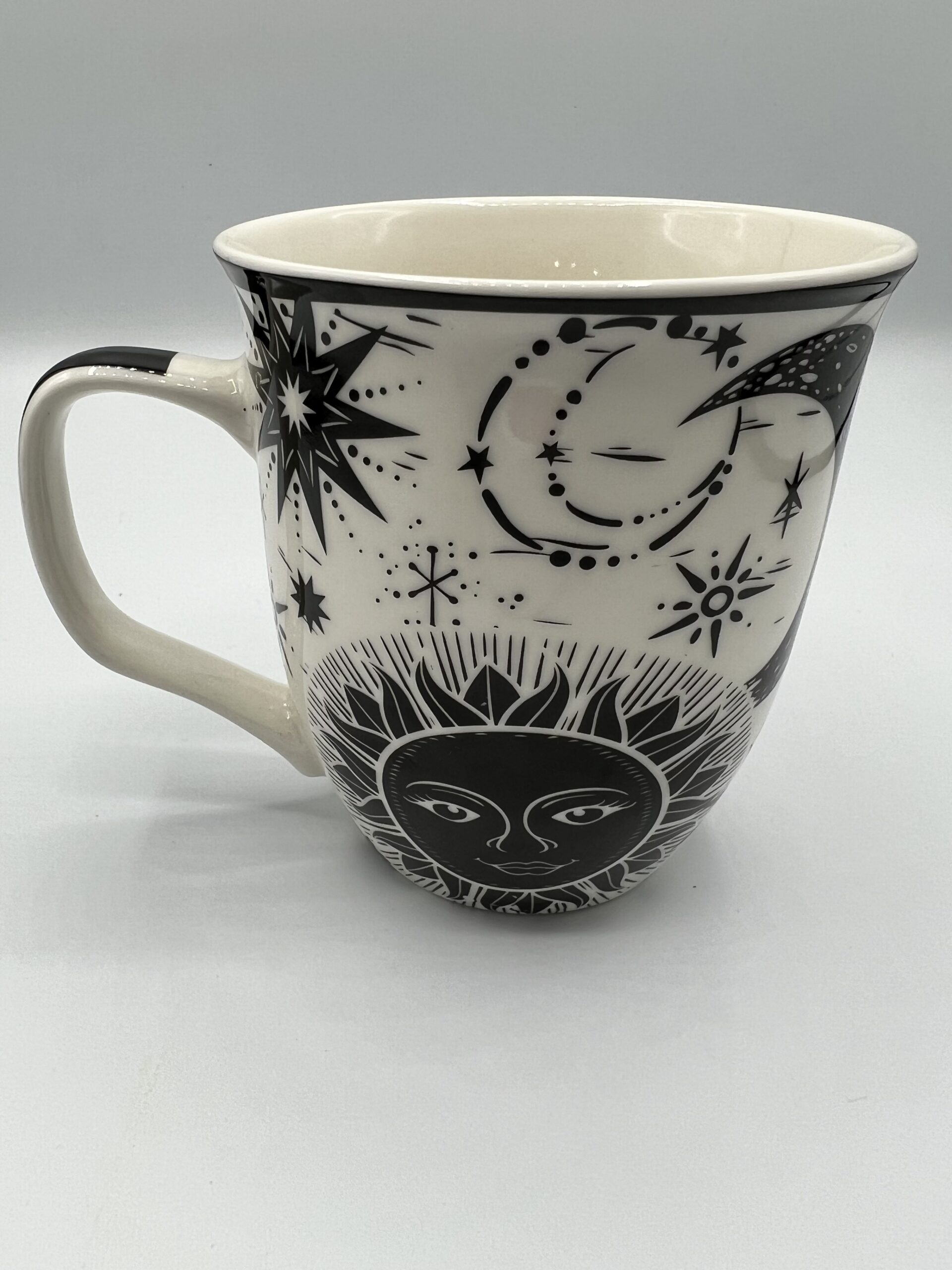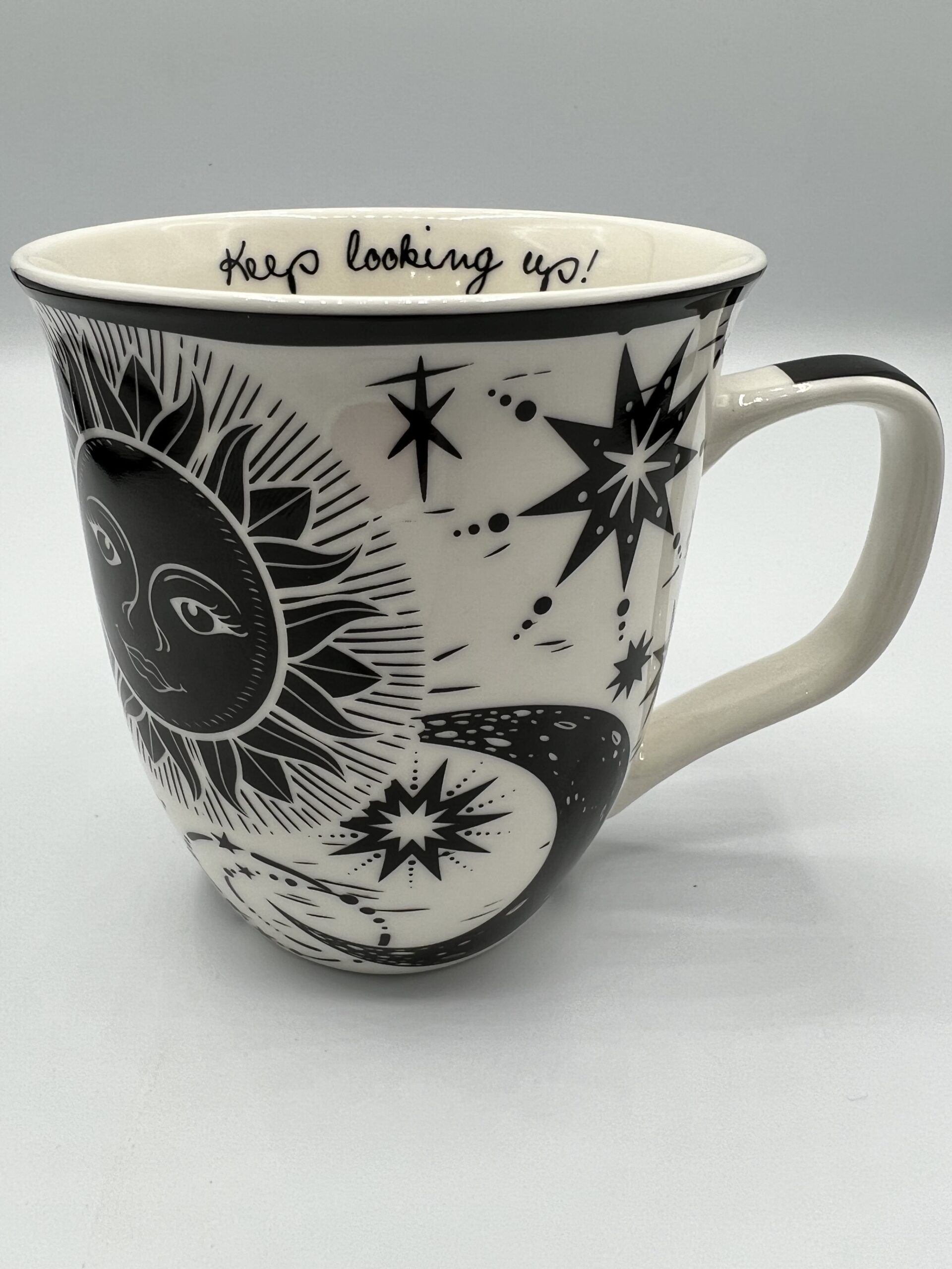 Fun and whimsical bohemian-styled mug, with the phrase"Keep looking up!" printed on the inside lip.