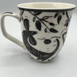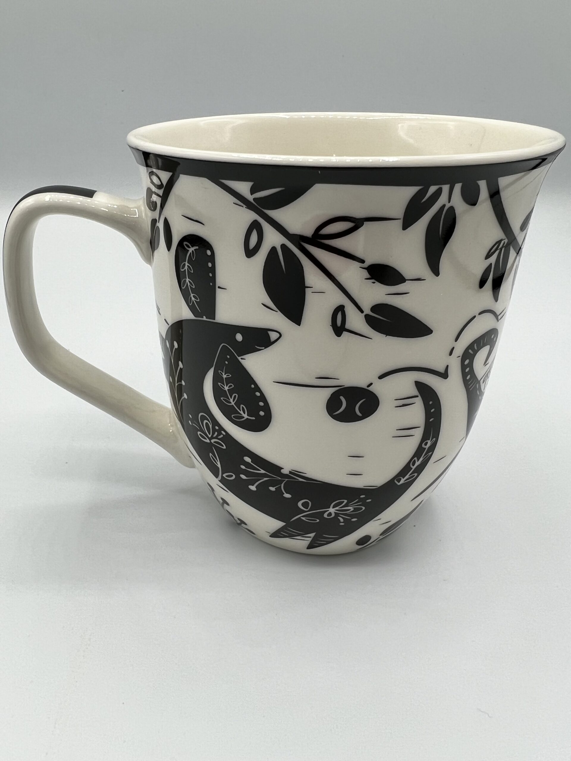 Fun and whimsical bohemian-styled mug, with the phrase "Peace Love & Dogs" printed on the inside lip.