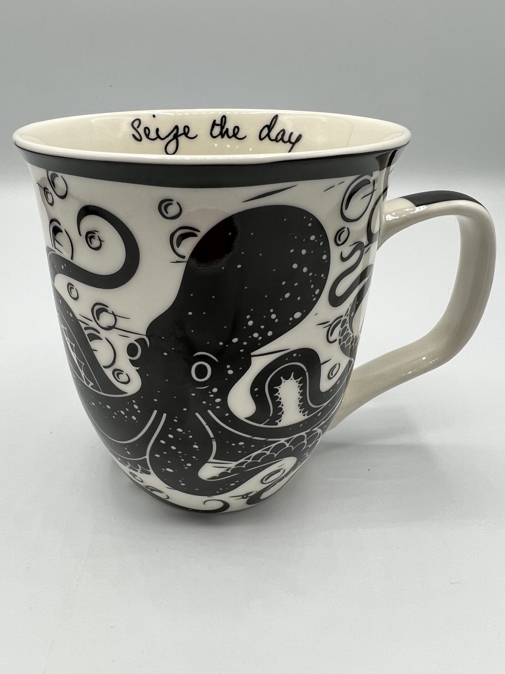 Fun and whimsical bohemian-styled mug, with the phrase "Seize the day" printed on the inside lip.