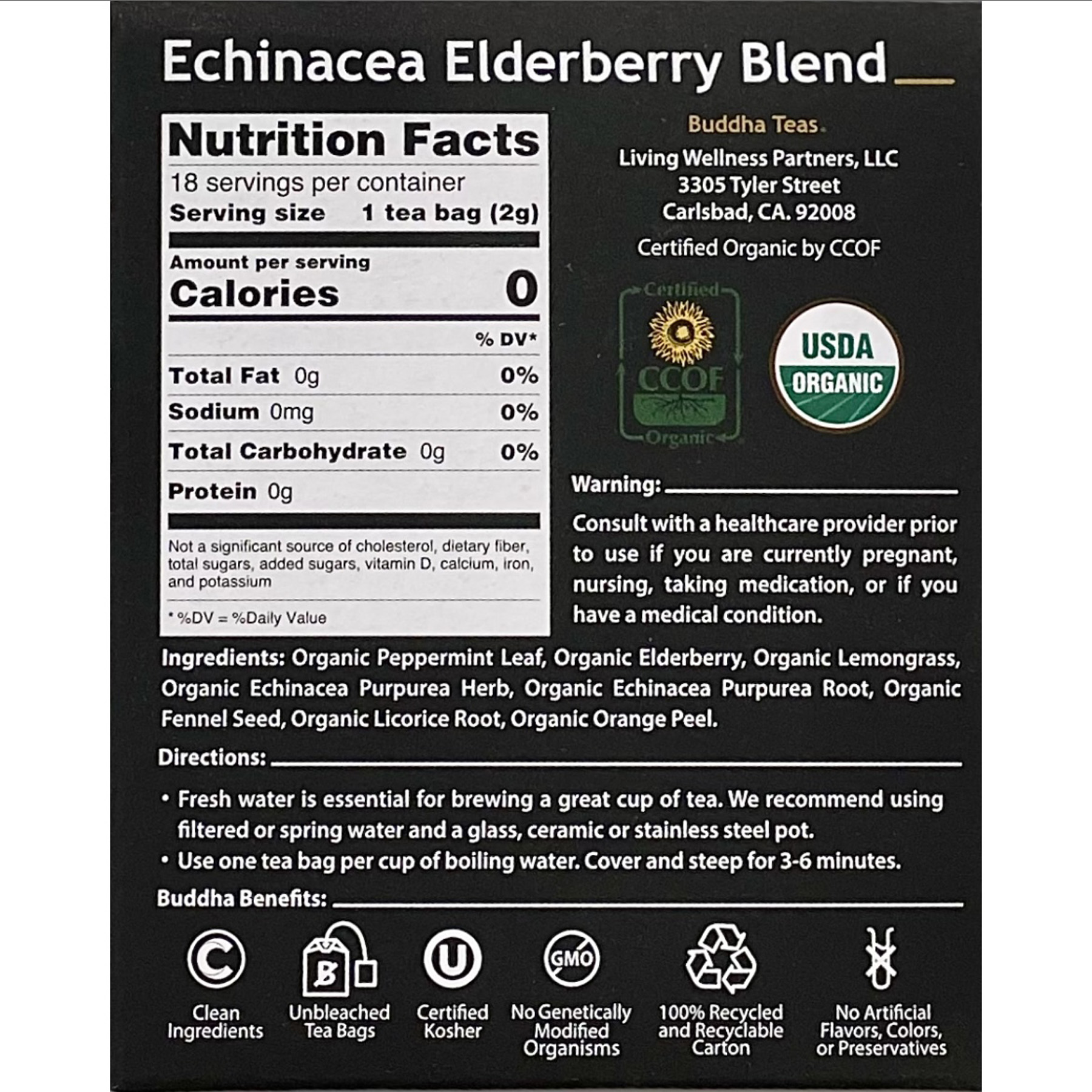Ingredients: Peppermint leaf, elderberry,  lemongrass, echinacea purpurea herb and root, fennel seed, licorice root, orange peel