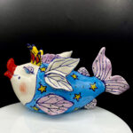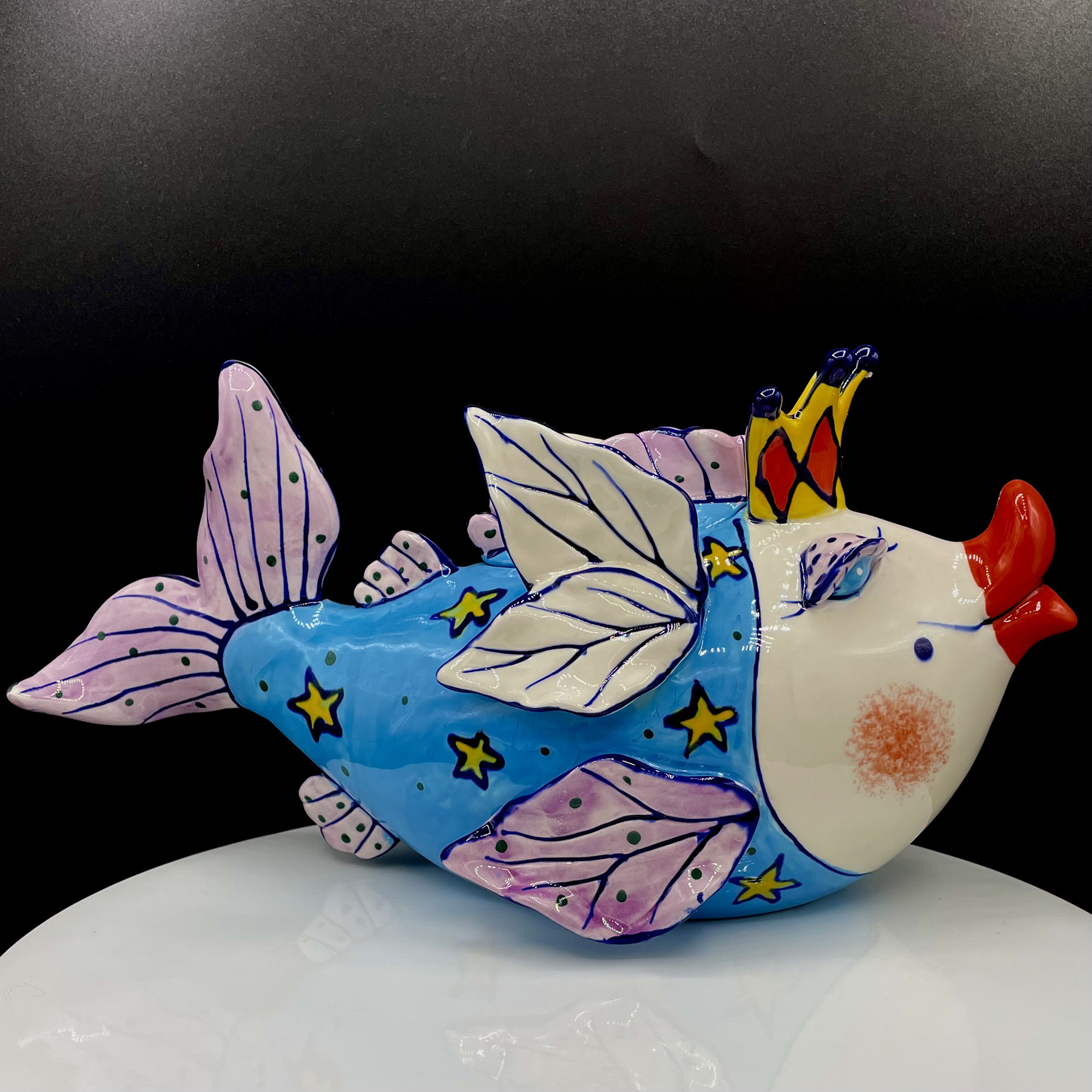 Say Hello to your Fairy Cod Mother! Time to make a wish and brew some tea with this completely functional fairy tail teapot. Makes 4-6 cups of tea and is sure to awaken your inner child and make all your tea dreams come true. Design features a big lipped whimsical purple finned fish wearing a golden crown with a body wrapped in golden stars on a field of blue.