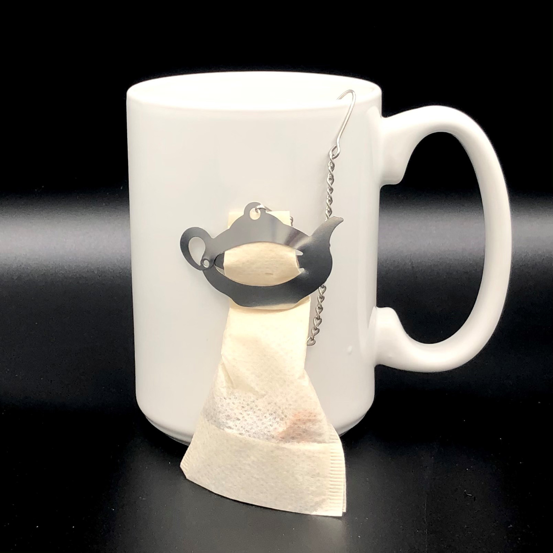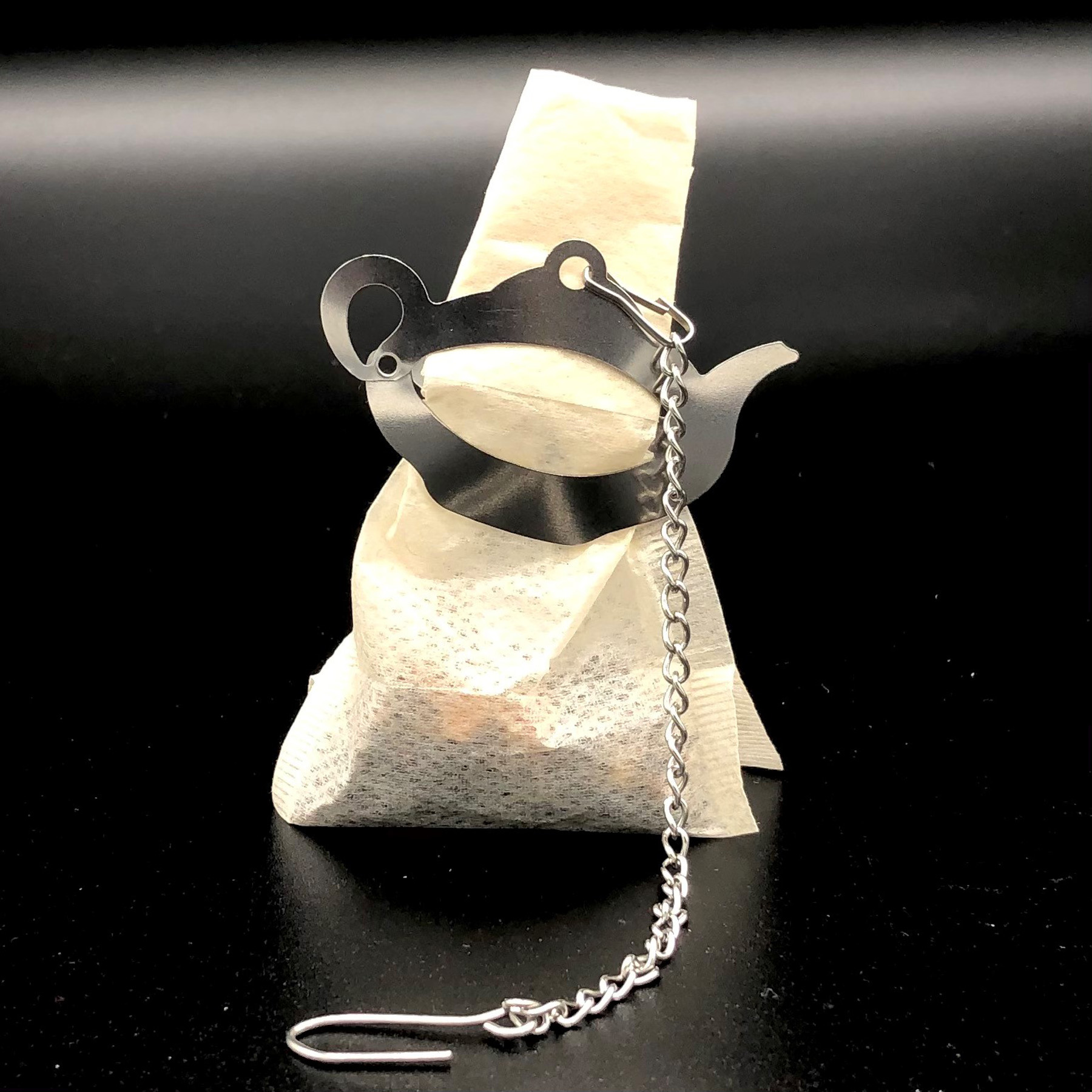 CompareStainless steel clip in the shape of teapot, perfect for closing your paper tea filters! Clip includes chain and hook for ease of use,