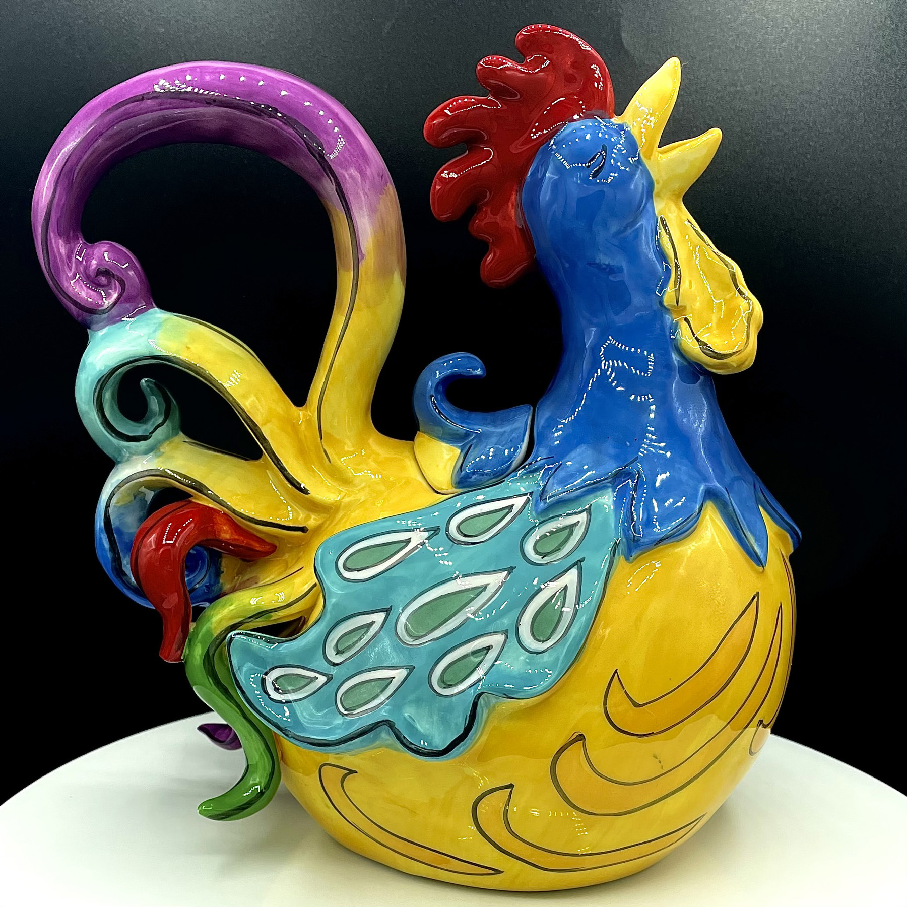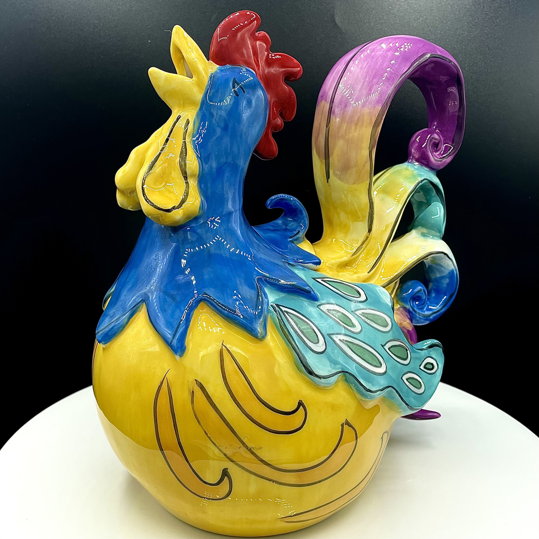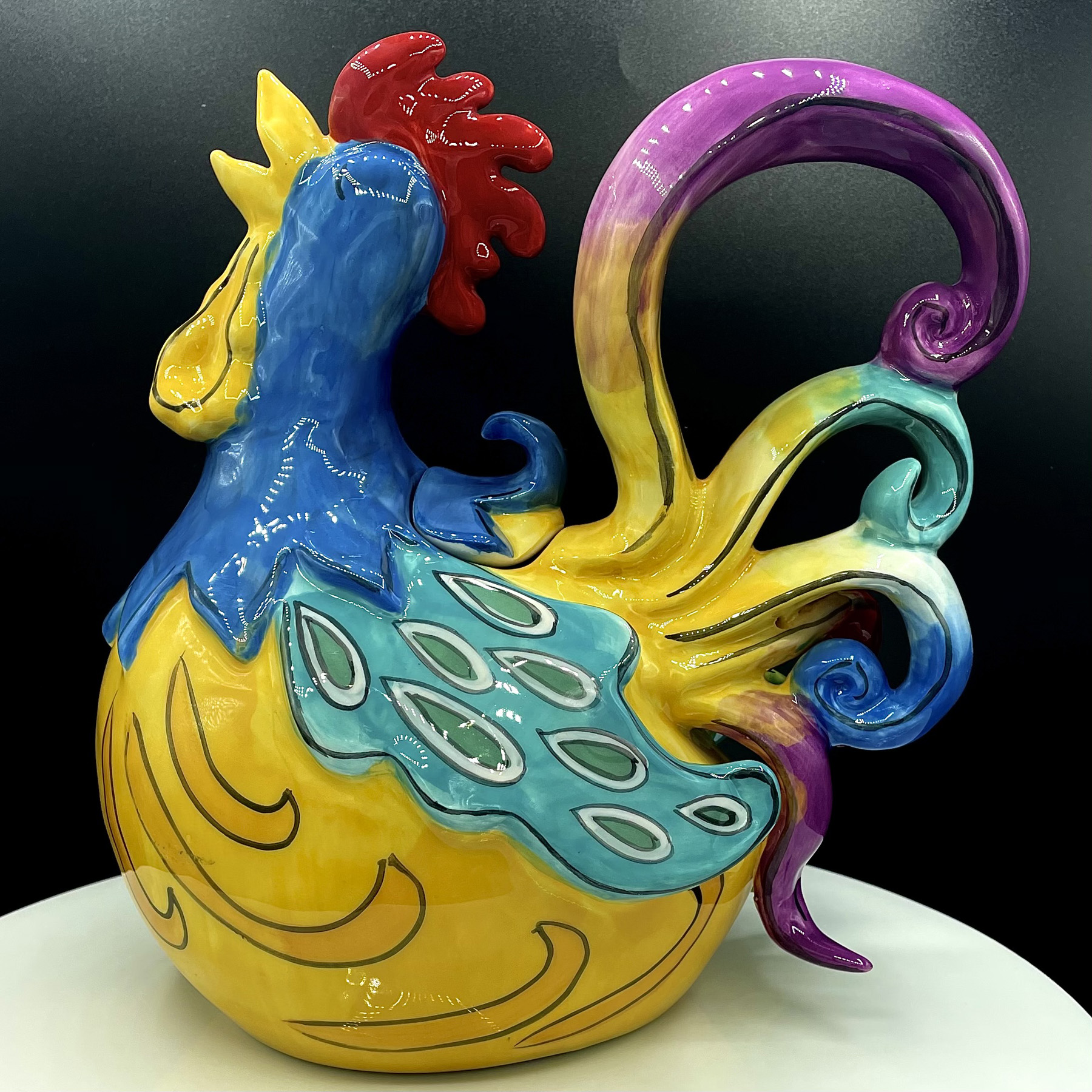 Gabby Glee Rooster Teapot is the perfect amount of whimsy and fun for your collection. This teapot is completely functional, holds 4-6 cups of teas. Design features a Rooster vividly painted with yellows, blues, and purples.