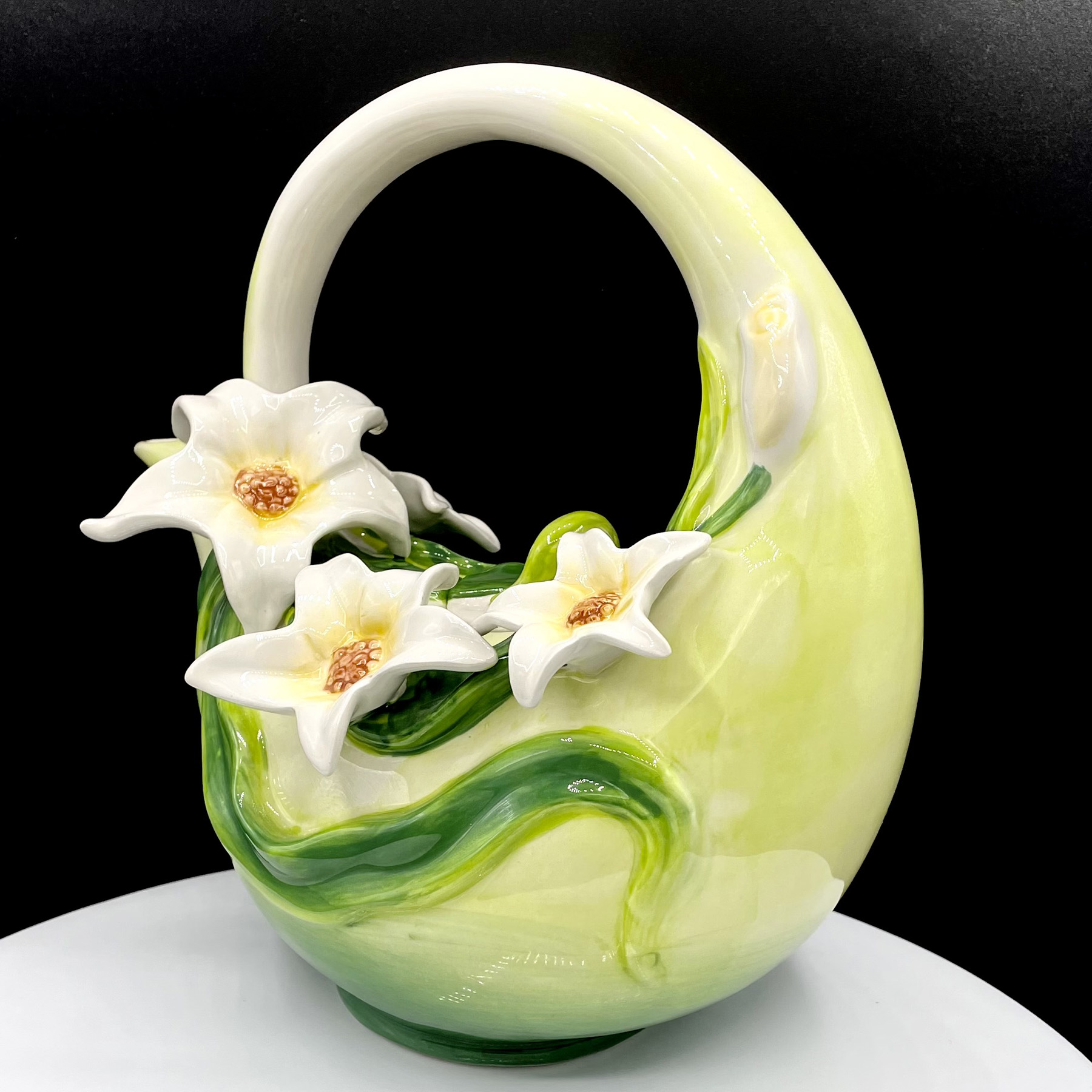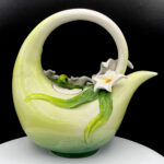 Elegant and classy, this Magnolia teapot is the perfect addition to any collection! Completely functional this teapot makes 4-6 cups of tea. The overall shape is reminiscent of a flower basket with the handle swooping from the back over the top to base of the spout. White magnolia blossoms and long dark green leaves cover the lid and drape down the sides completing the flower basket look. Fading from deep green at the base of the teapot to a soft cream at the top of the handle, this is a must have teapot.