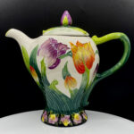 Tall and elegant this teapot is a perfect addition to any collection! This functional art piece holds 4-6 cups of tea and has a black base with purple and yellow violets and leafy green handle and lid topped with a purple tulip bud and white swirls. The main body of the teapot is white and features orange and purple tulips and buds with leaves of deep green fading up to light leaf green.
